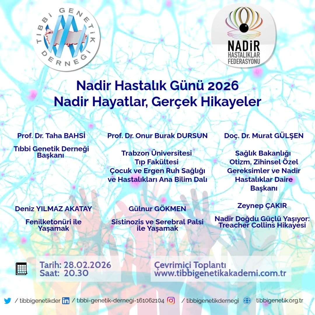 Nadir Hastalıklar Günü etkinliği kapsamında Tıbbi Genetik Derneği tarafından 28 Şubat 2026 Cumartesi Akşam 20:30’da Prof. Dr. Taha Bahsi, Prof. Dr. Onur Burak Dursun ve Doç. Dr. Murat Gülşen hocalarımızın moderatörlüğünde, Deniz Yılmaz Akatay, Gülnur Gökmen ve Zeynep Çakır’ın konuşmacı olduğu ‘Nadir Hayatlar, Gerçek Hikayeler’ oturumu gerçekleştirilecektir.